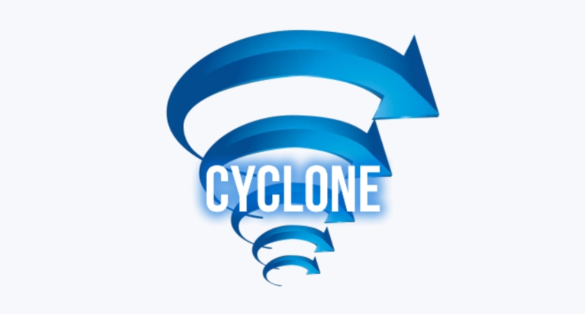 サイクロンは、その本体内で旋回気流中の固体粒子に作用する遠心力Zが、重力場における粒子自身の自重Gに対して、Z/G=300~2000倍となるため、構造が簡単でありながら極めて大きな遠心効果が得られます。